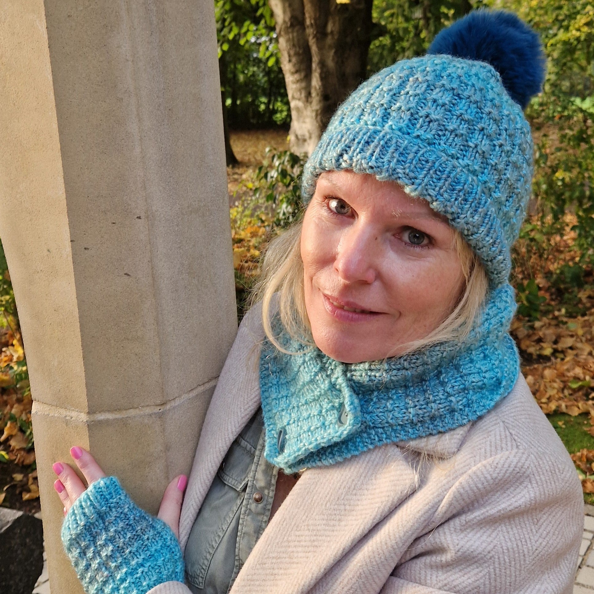 Infused with charm and crafted for comfort, this coordinated turquoise handknit set is a celebration of colour and character. The beanie hat features a detachable pompom for a touch of whimsy, while the neck wrap fastens with two neat buttons for snug, stylish layering. Fingerless gloves complete the trio, offering warmth and freedom for hands on the go. Bundle all three together and save £5.